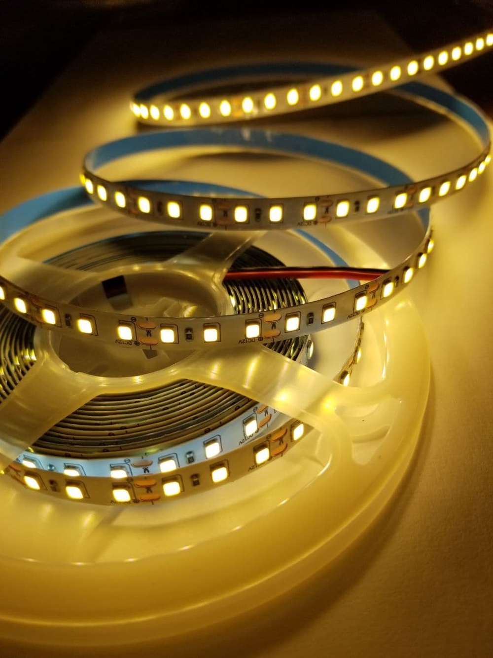 Светодиодная лента 120 диодов на 1 метр ленты дает теплый белый свет (3000К). Размер диода составляет 2,8х3,5 мм.